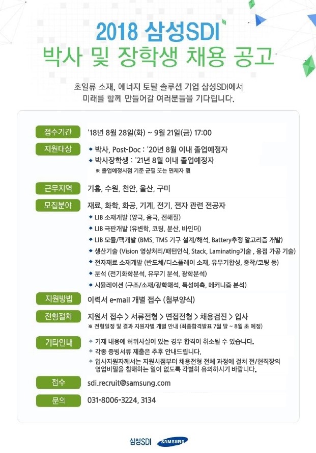 [삼성SDI] 박사 및 장학생 채용(~9/21)