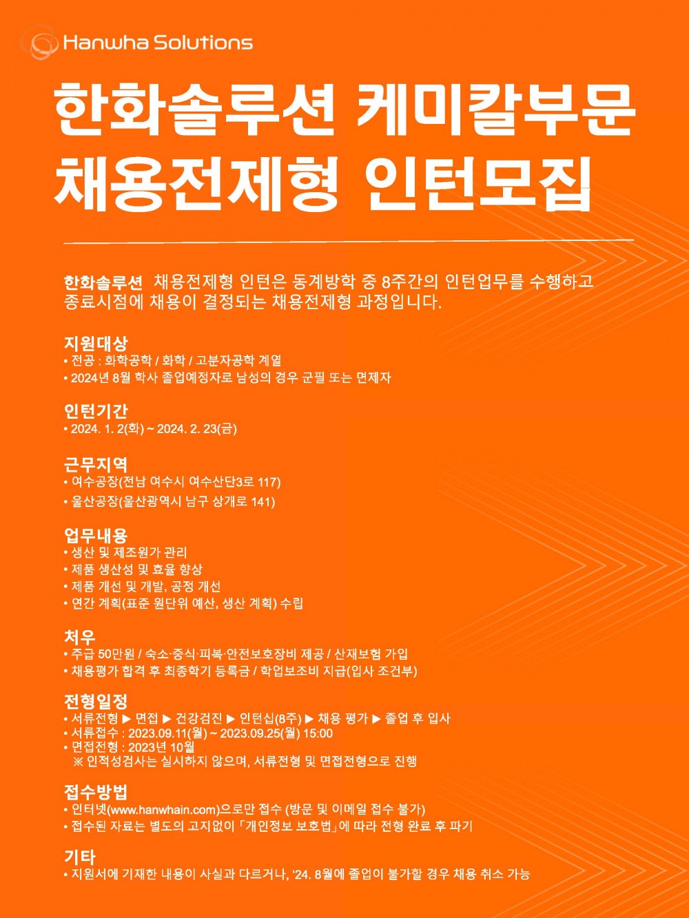[한화솔루션] 한화솔루션 케미칼부분 채용전제형 인턴모집 (9/11 ~9/25)